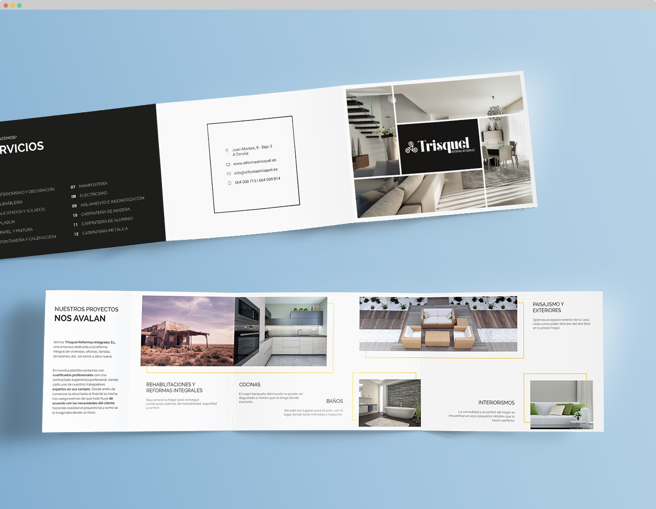 Diseño de folleto comercial para nuestro cliente Reformas Trisquel. Se adaptó la información para encajarla en un tríptico con plegado envolvente.